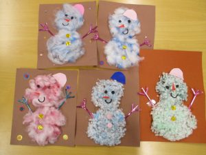 雪だるま制作⛄ アルミホイルにクレヨンを塗り、綿に色を写していきます🖍 画用紙に貼り付け思い思いに作成していきます💨 かわいく仕上がりました! 利用者と職員で冬の壁画も作成中・・・ 毎日コツコツ取り組んでいますので完成が楽しみです☃